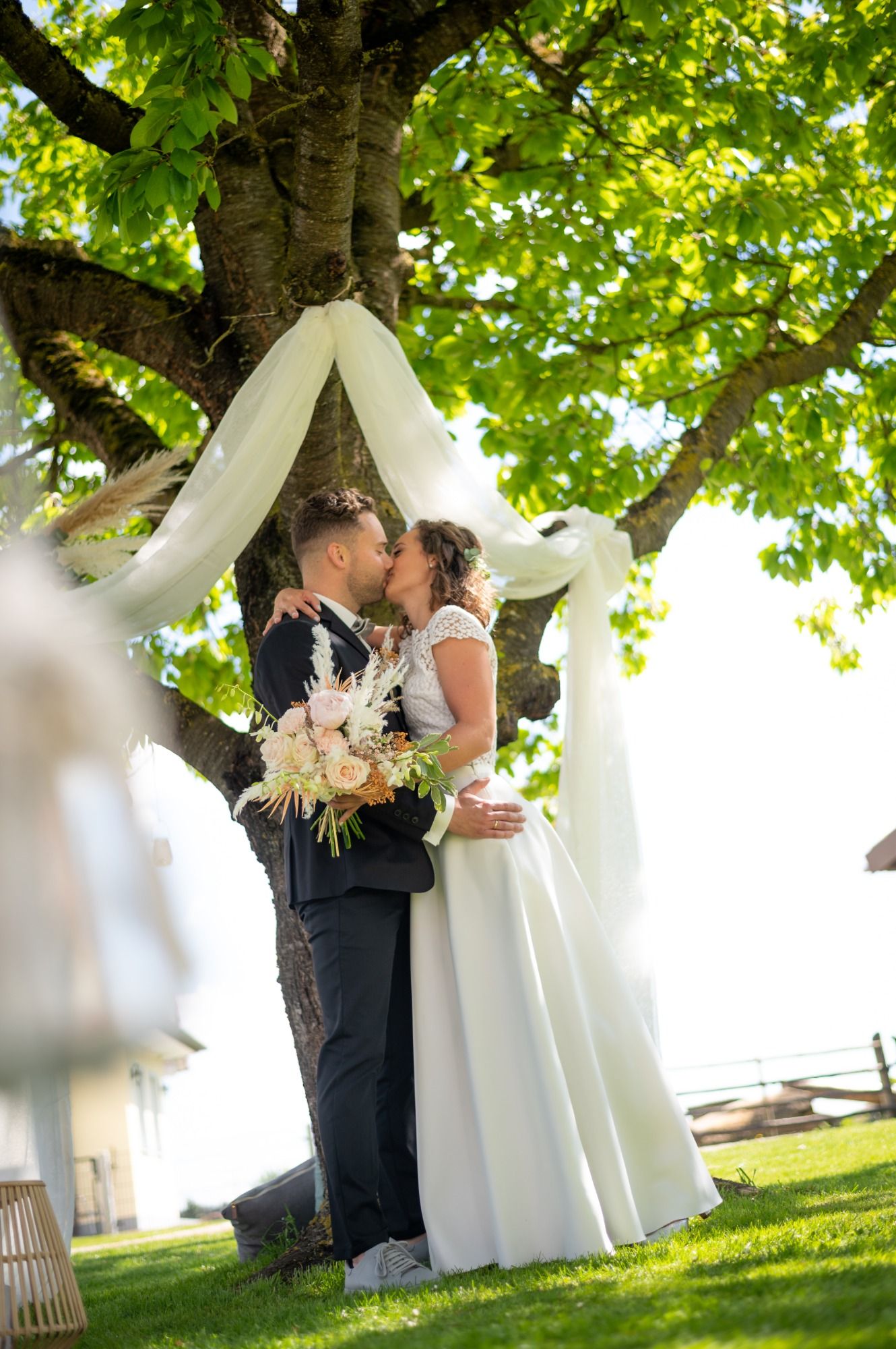 Und was soll ich sagen, ich bin verliebt in den wunderschönen freien Platz mit dem alten Kirschbaum. Man fühlt sich sofort wie zu Hause angekommen. Ob ein Traubogen im Boho-, Vintage-Style oder einfach nur den Kirschbaum mit Stoffbahnen behängen, ich sehe eure freie Trauung schon vor mir.